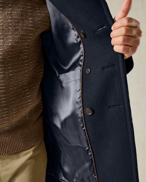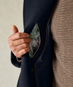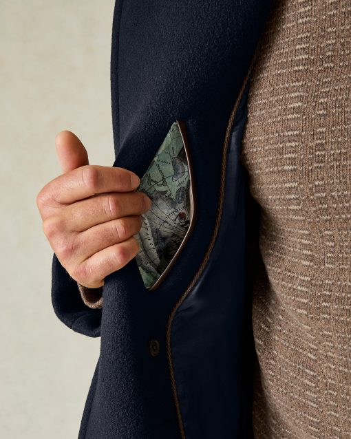 In addition to the luxurious leather buttons, the coat boasts a leather collar stand, enhancing both its durability and sense of refined style. Practical welt pockets offer both utility and elegance, with a special touch—each map-lined pocket features a section of Antarctica, paying homage to the legendary journeys of Henry Worsley.