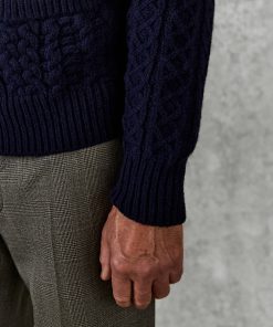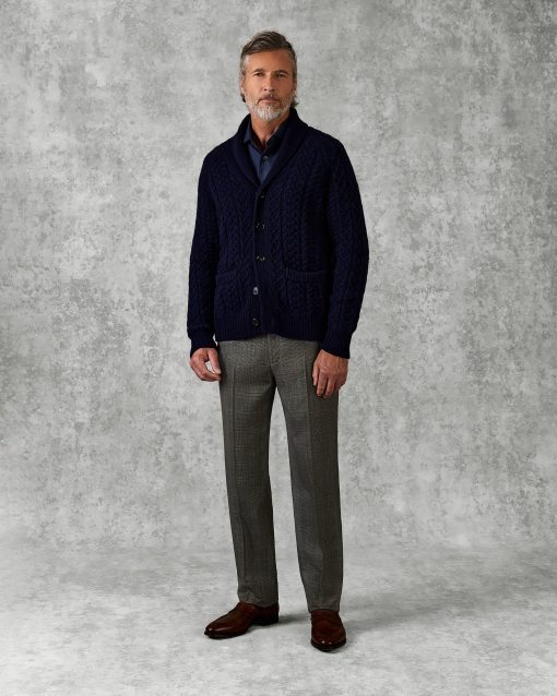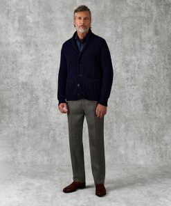 Refined and effortlessly stylish, the Crompton Cardigan in Navy by Gieves and Hawkes embodies British elegance. Crafted meticulously with a 3-gauge cable knit, this cardigan features ribbed welt pockets and a distinguished shawl collar, ensuring both warmth and sophistication. The luxurious texture and handmade feel are perfectly complemented by five buttons, offering a perfect balance between casual charm and timeless design.