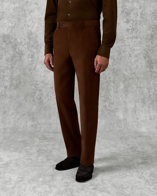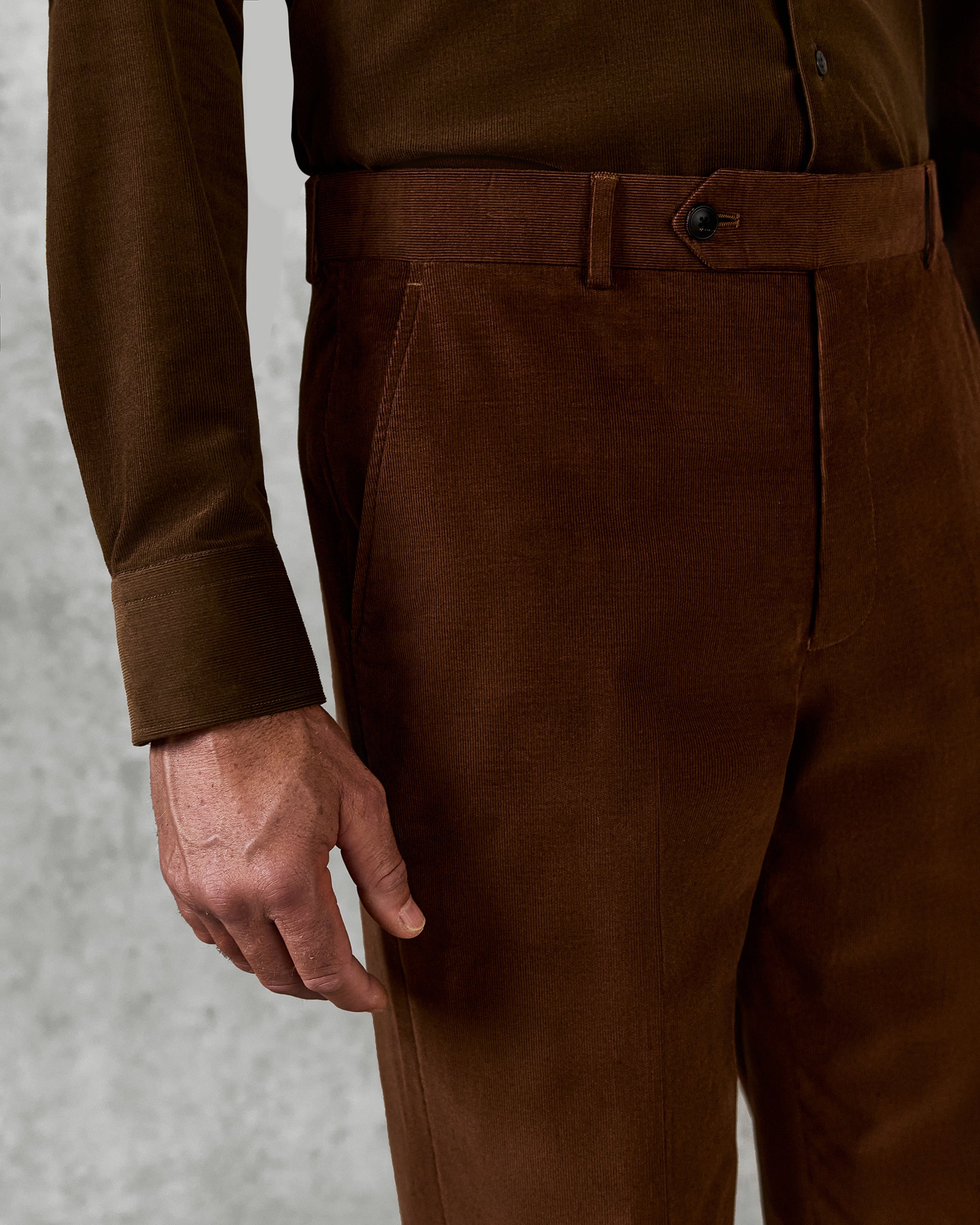 The Dodge Suit Trouser in Brown Baby Cord is tailored from soft Italian corduroy with a touch of stretch for comfort and ease. Featuring a flat front, dark horn buttons, and an unfinished hem, it’s a modern staple with relaxed sophistication.