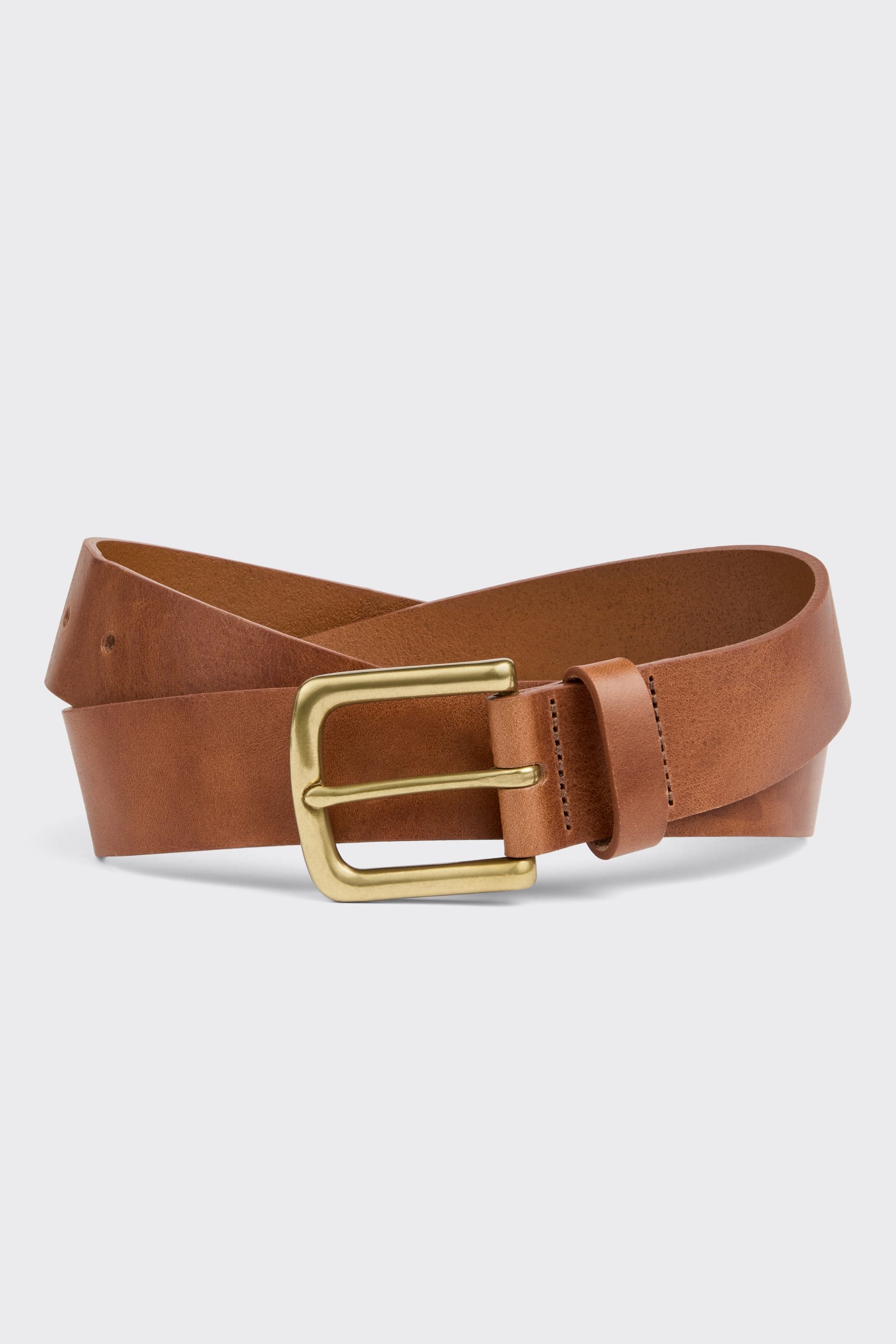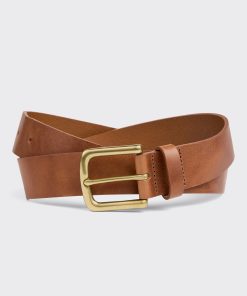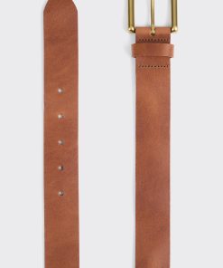 Exuding sophistication, the belt features a curved antique brass buckle that seamlessly complements its rich tan hue. A thoughtfully designed leather belt loop adds to its cohesive look, ensuring that it sits elegantly around your waist.