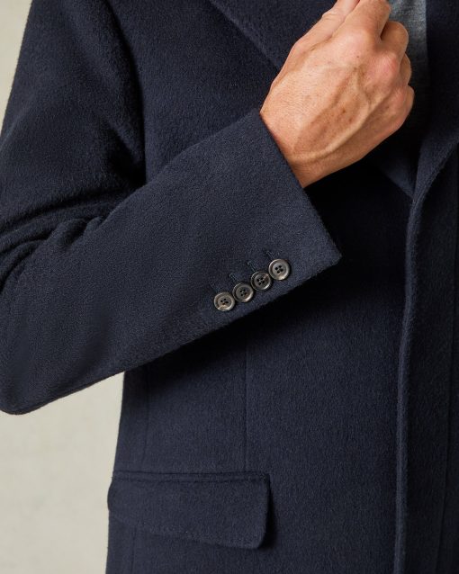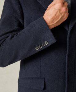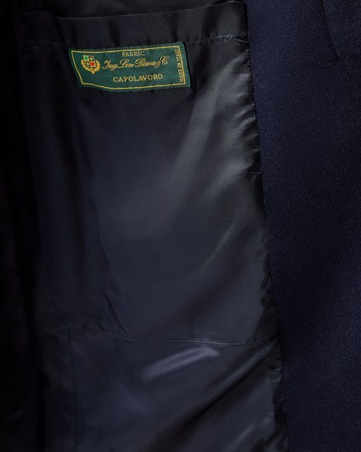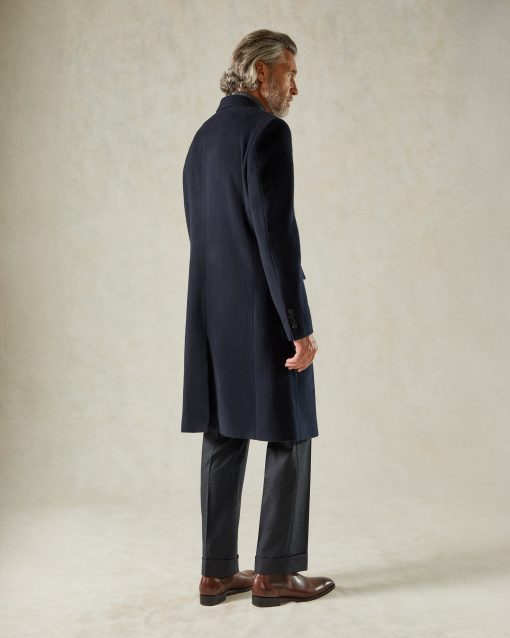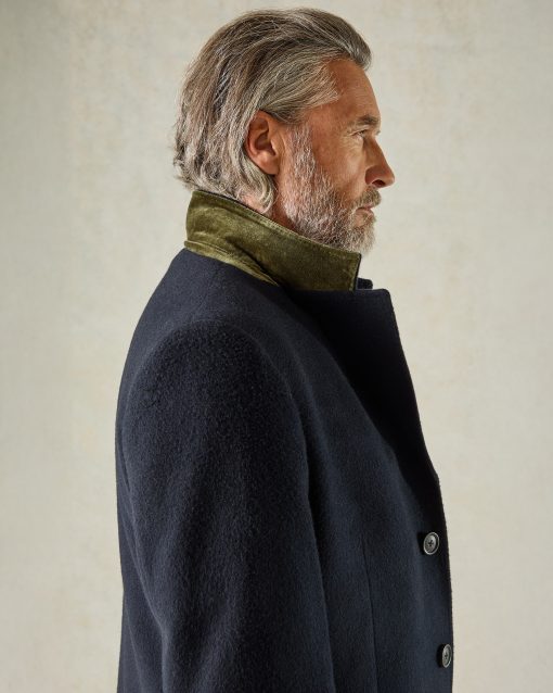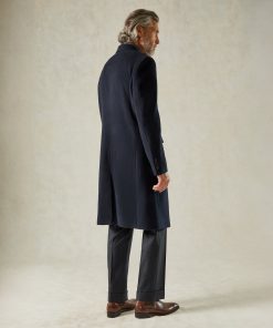 Exude timeless elegance and sophistication with the Kingsley Top Coat Navy by Gieves and Hawkes. This Single breasted three button Car Coat, adorned with a refined notch lapel, presents a seamless blind fly front and flap pockets that contribute to its sleek, formal look. Made to the highest standards, this coat features an exquisite touch of velvet on the undercollar, adding a layer of luxury to your ensemble.