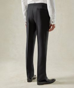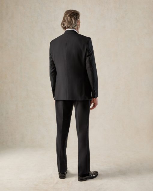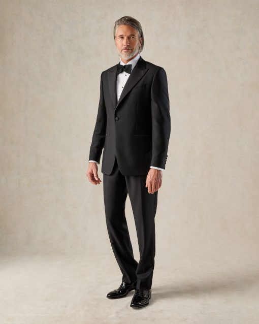 Complementing the ensemble, the flat-front trousers offer side adjusters for a perfect fit and a subtle grosgrain stripe for added luxury. Crafted from premium fabrics sourced from the esteemed Dugdale Bros mill in England, this suit is perfect for formal occasions, exuding both comfort and impeccable style.