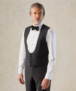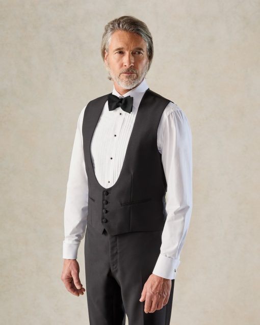 The waistcoat, with its four-button design and horseshoe front, adds a contemporary touch while maintaining classic sophistication.