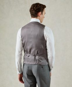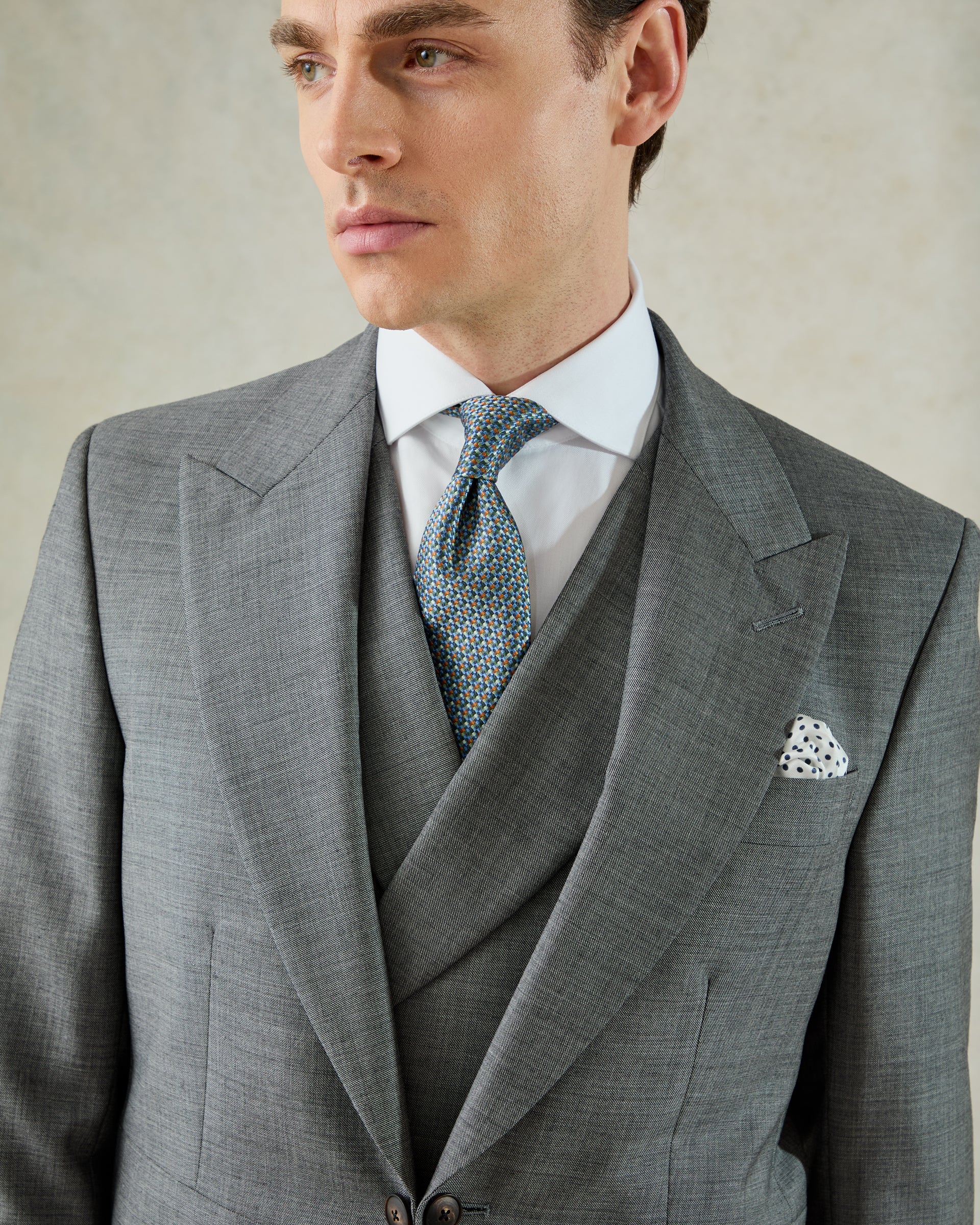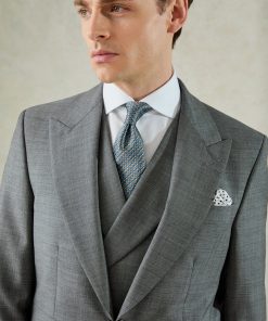 The Torlesse Morning Waistcoat Grey Sharkskin tailored from exquisite grey sharkskin fabric, features a double breasted design with six buttons and two slanted welt pockets, ensuring both style and functionality. The back and martingale lining add an extra layer of sophistication, highlighting the meticulous craftsmanship synonymous with Gieves and Hawkes. Whether paired with a matching suit or worn as a contrasting piece, the Torlesse Waistcoat stands as a testament to timeless British tailoring.
